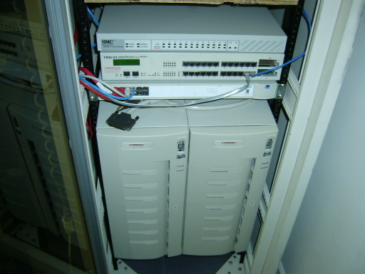 An old SMC 12 port 10base hub, a Cabletron TRXI-24 24 port MAU (Tolken ring) And a 3Com SuperStack 12 port 100base hub. The 2 towers on the bottom are drive arrays, they conain 7 4.3gig drives each.